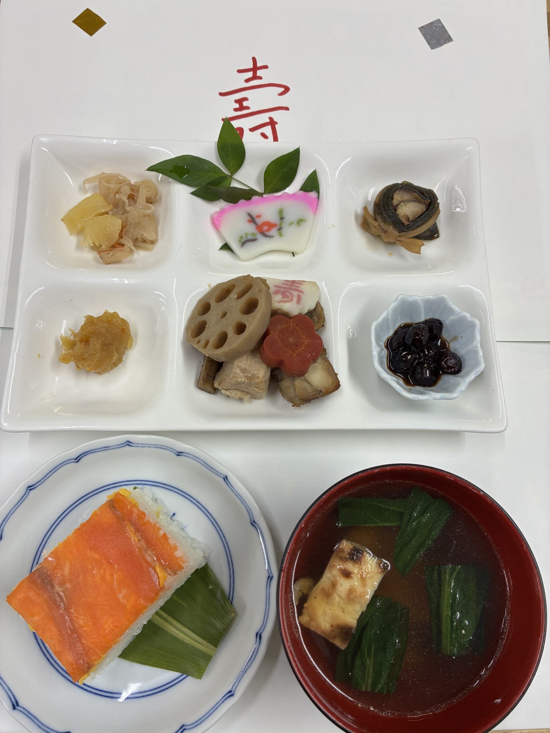 今年最初の昼食はお正月らしく押し寿司や煮物でした。